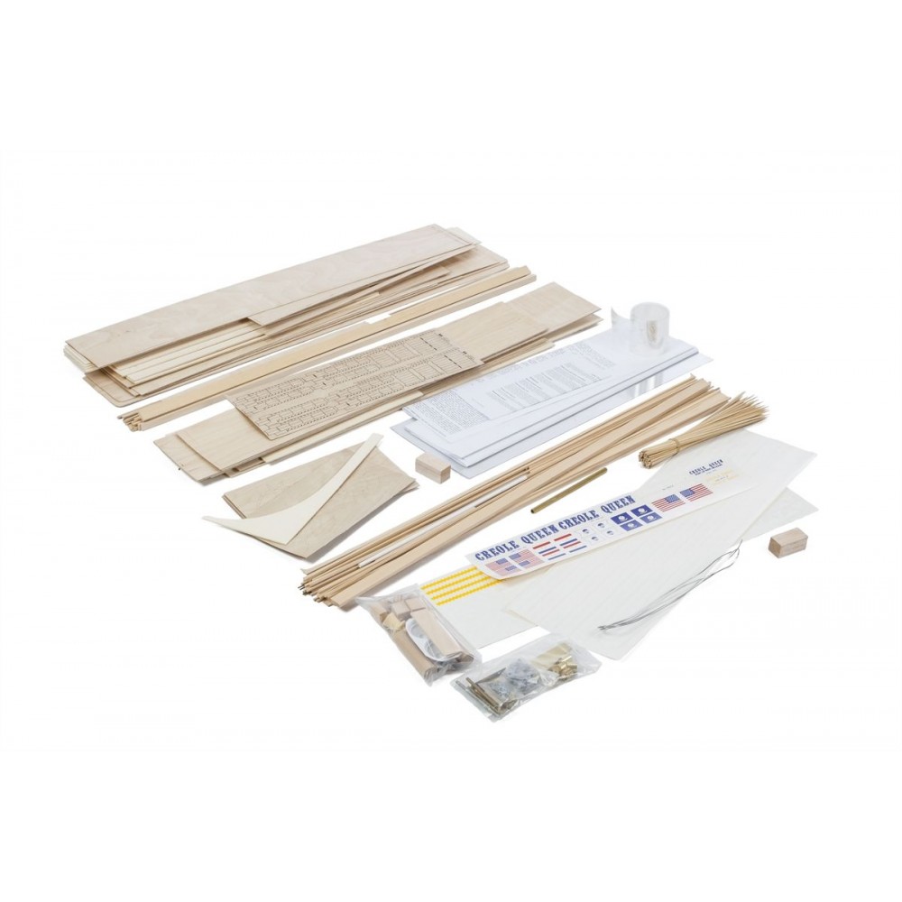 Kolesový říční parník 1219mm v rozsypu pro zkušeného stavitele. Trup a nástavby z předseknutých překližkových a mahagonových dílů a balsových a smrkových planěk. Množství maketových doplňků z kovu, dřeva a plastů.