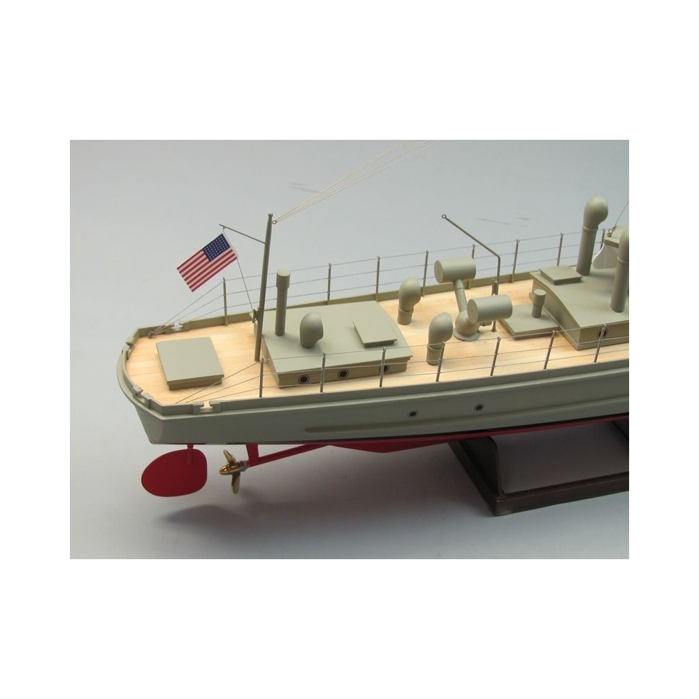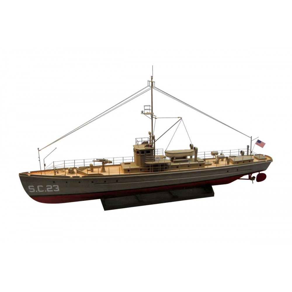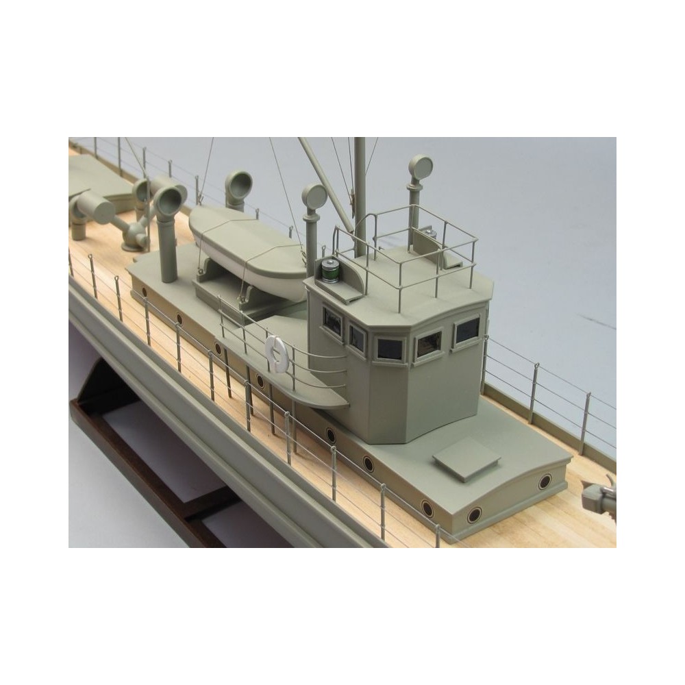 Stavebnice amerického stíhače ponorek v rozsypu v měřítku 1:35 pro pohon elektromotorem řady pro mírně pokročilé stavitele. Díky vysokému předpracování většiny dílů není stavba nijak zvlášť náročná na zručnost a dílenské vybavení - ale samozřejmě pečlivá a trpělivá práce je v lodním stavitelství nezbytná pro dosažení dobrého výsledku. Pro lepení budete potřebovat střední a husté vteřinové lepidlo, "acetonové" modelářské lepidlo, epoxid a lepidlo pro lepení plastikových modelů. Vlastní stavba probíhá dle perspektivních výkresů zobrazujících detailně konstrukci dané části lodi, pro vybrané klíčové kroky (jako je stavba kostry trupu) slouží stavební přípravky z předseknutých překližkových dílů. Zhotovování doplňků jako jsou třeba žebříky usnadňují předtištěné šablony v měřítku 1:1.
