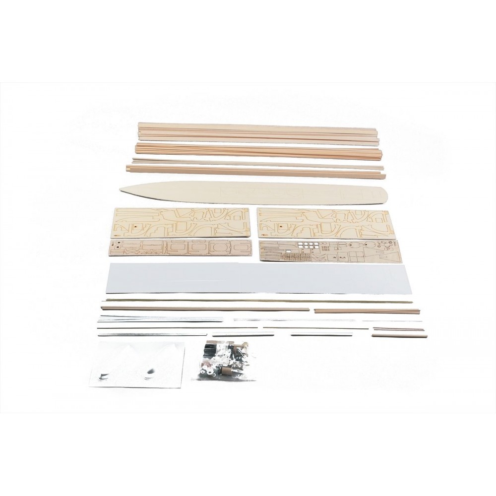 Trup je tvořen (stejně jako u skutečné lodi) kostrou, jejíž páteř tvoří kýl s nalepenými žebry - všechny díly jsou překližkové, vyřezávané laserem; stavební přípravky zaručující správné sestavení kostry jsou předseknuté. Obšívka trupu je tvořena balsovými lištami - použití měkkého dřeva usnadňuje ohýbání a tvarování planěk (bez nutnosti namáčení) i jejich následné broušení. Pro dosažení složitějších tvarů ale samozřejmě budete muset sáhnout po namáčení (ve zředěné čpavkové vodě 1:1 za studena nebo v horké vodě s přídavkem tekutého avivážního prostředku) - ale díky promyšlené konstrukci lodi jen vyjímečně. Paluba je překližková a nástavba je z vakuově lisovaných plastových dílů s balsovou a překližkovou kostrou z laserem vyřezávaných dílů.