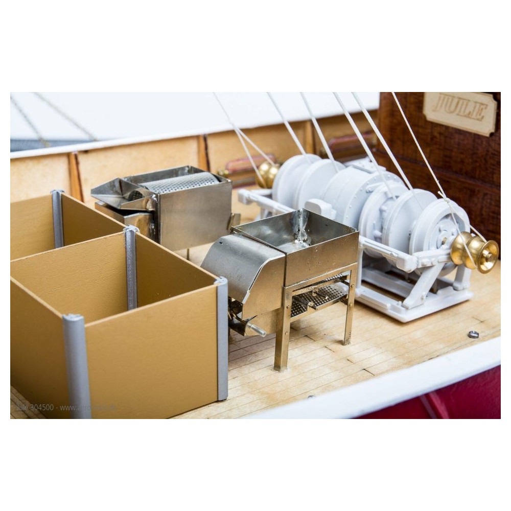 Všechny laserem řezané překližkové díly potřebné pro stavbu, mahagonové díly i disky, Depronhelling, kování, lodní hřídel, kormidlo a stojan. Kormidelna je zcela postavena. Komplexní sada leptaných dílů z niklového stříbra, která je rovněž součástí stavebnice, obsahuje světlomety, vibrační síto, vařič, třídicí systém a mnoho dalšího. Rozsáhlá sada kování z litých kovových dílů ještě více umocňuje bohaté vybavení. Model lze vybavit mnoha dalšími speciálními funkcemi. Pro rozšíření o světelné funkce doporučujeme světelný modul EasyLight (obj. č. AERO701903). Video Jule v akci můžete najít na YouTube.