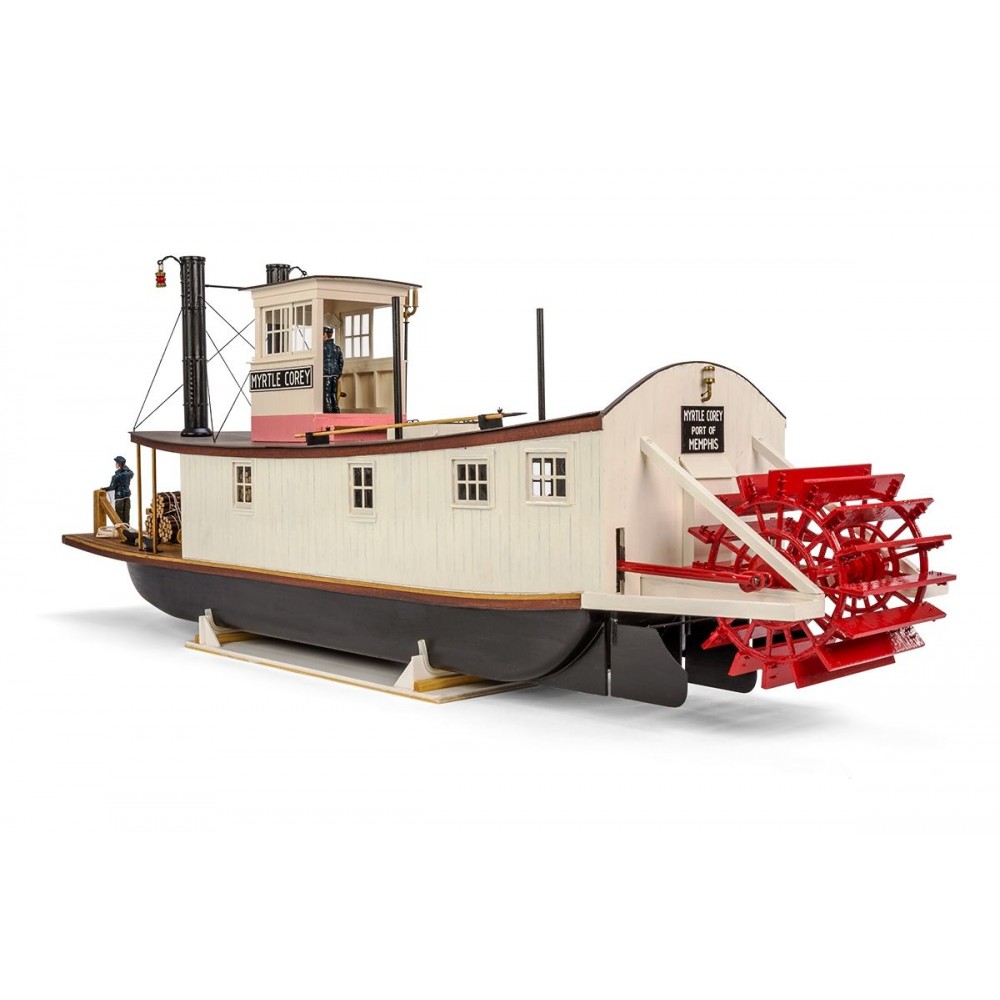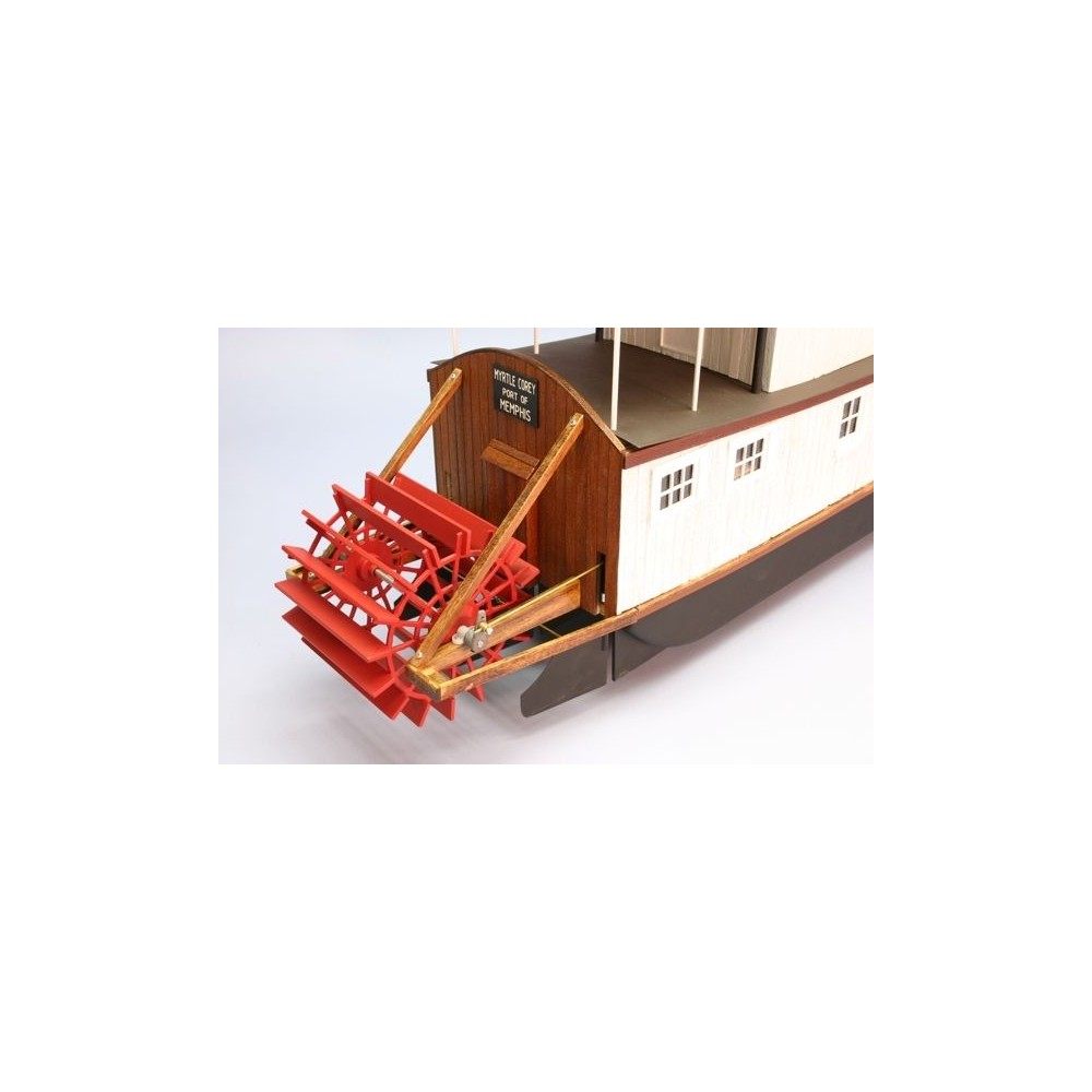 Stavebnice tlačného parního kolesového remorkéru 965mm z 19. století z oblasti Memphisu. Plastový trup a nástavby s předseknutými díly a vnějším dřevěným plaňkováním, laserem vyřezávané překližkové a balsové díly, množství maketových doplňků, včetně dílů kolesa.