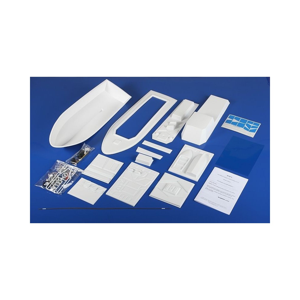 Stavebnice rychlostního člunu pro elektromotory řady 400. Model v rozsypu s trupem a nástavbami z...