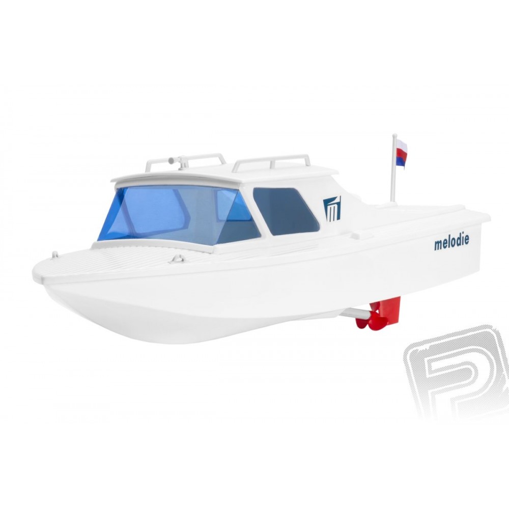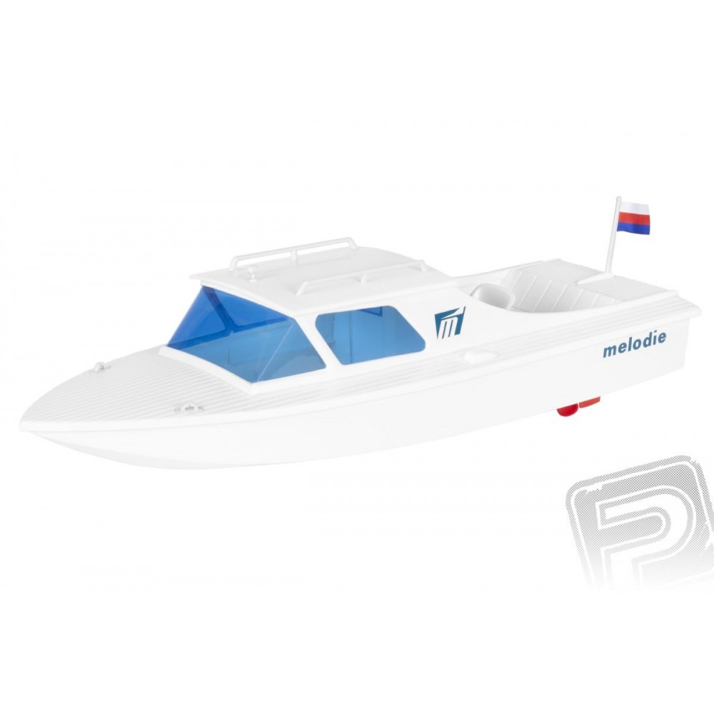 Dnešní Melodie zachovává věrně tvary své prababičky; stejně jako dříve má trup a nástavby z vakuově lisovaných plastových dílů. Stavbu urychlí nová paluba plastová paluba a další díly nahrazující překližku v původní stavebnici. Loď můžete postavit jako volně plovoucí retro model s motorem Igla 4,5 V napájeným z ploché baterie nebo ji upravit pro dálkové ovládání. A vrátit se aspoň na chvíli do dětství...