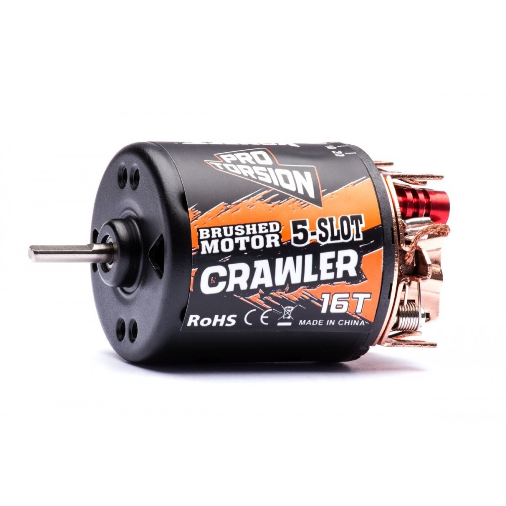 Stejnosměrný pěti slotový motor velikosti 540 uložený v kuličkových ložiskách. Provozní napětí: 2S - 3S LiPo/6-9čl NiMh/NiCd, 16 závitů, 1.900 o/min. na 1,0 V, hřídel 3,175mm. Průměr 36mm, Délka 53mm. Motor je rozebíratelný a s možností výměny uhlíků. 5 SLOT - 16 závitů = 27 až 35 závitový standard motor.
