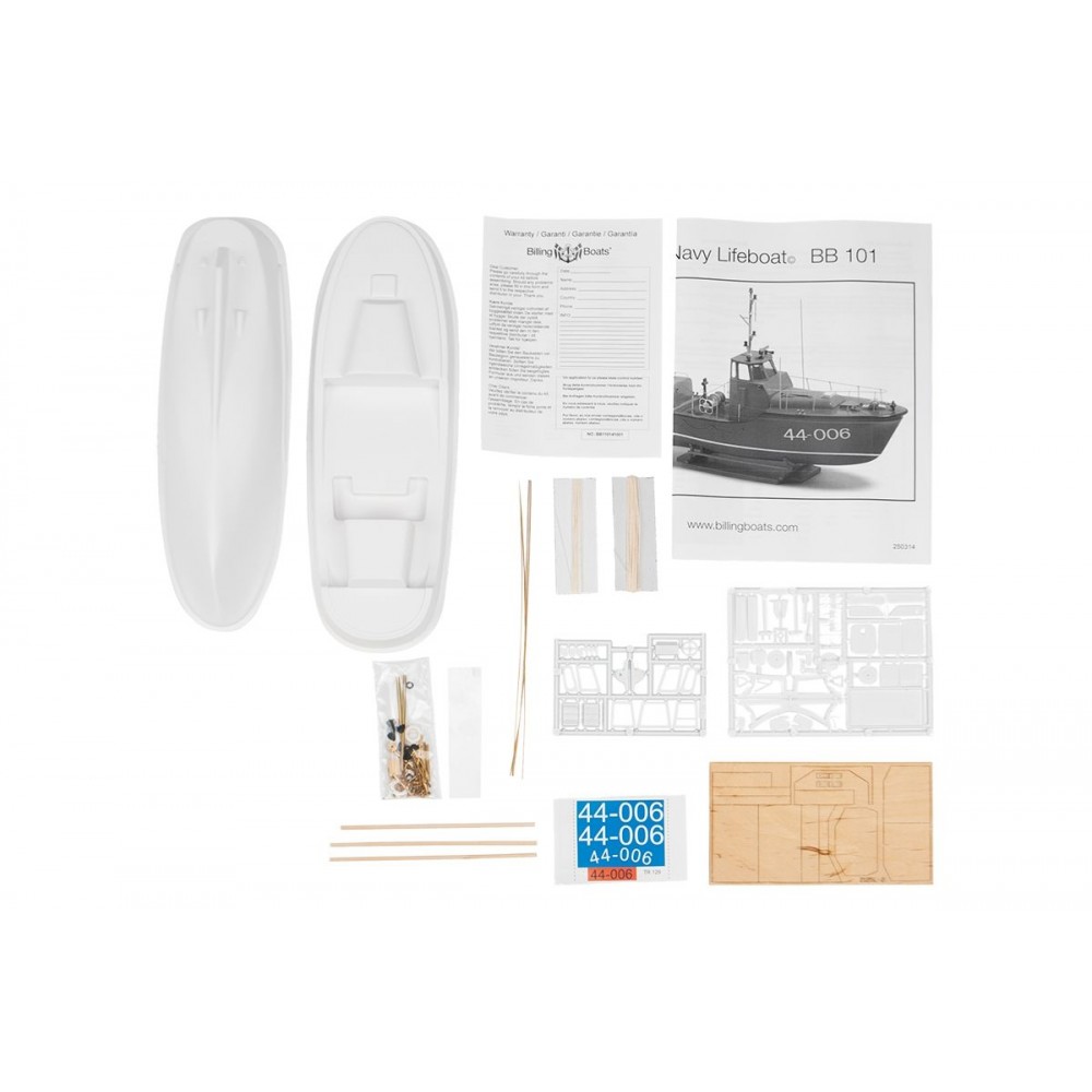 Záchranný člun Royal Navy má trup tvořený plastovým výliskem, plastovou palubu a dřevěnou nástavbu. Stavebnice obsahuje všechny plastové a dřevěné díly potřebné pro dokončení modelu, maketové příslušenství (např. poziční světla, kotvu, záchranné kruhy, lodní šroub atd.).