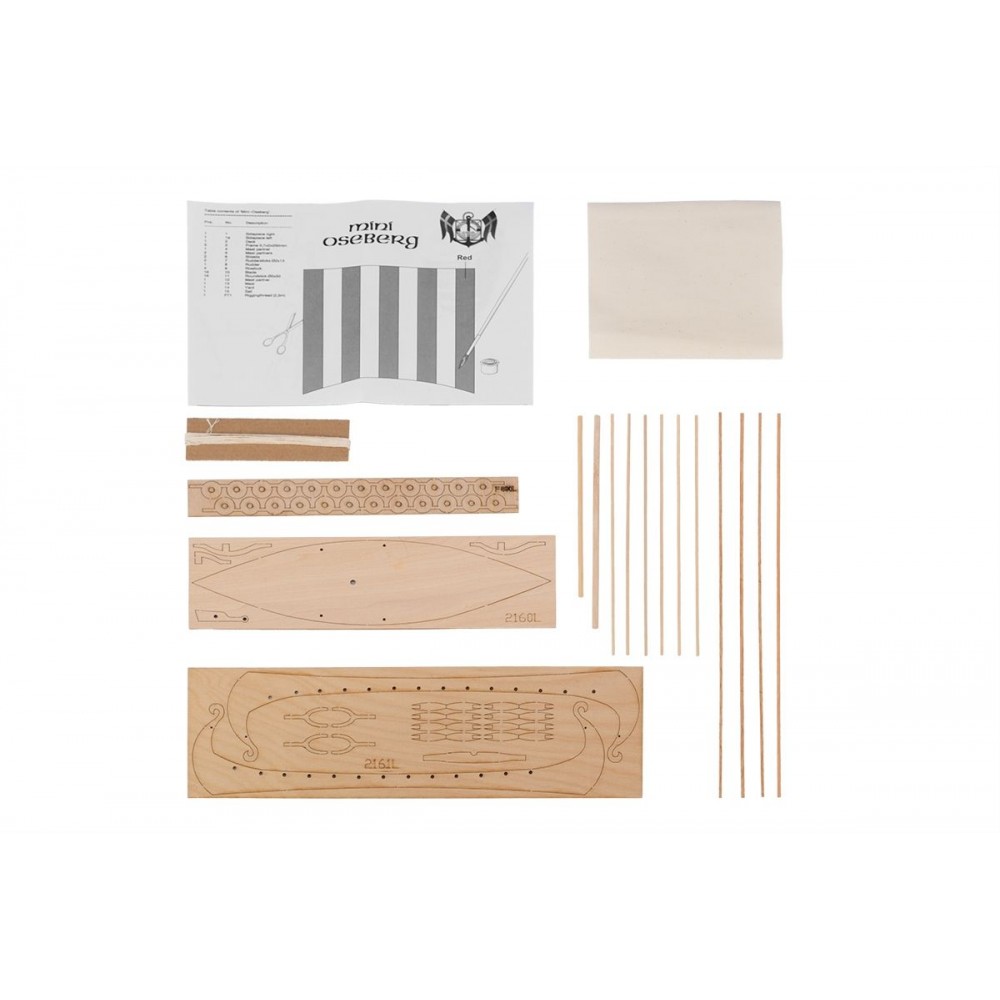 Mini Oseberg má trup jednoduché dřevěné konstrukce z laserem vyřezávaných dílů s dýhovou obšívkou a dřevěnou plaňkovou palubu. Trup je "seříznut" na čáře ponoru - podobně jako u "waterline" plastikových kitů. Stavebnice obsahuje všechny dřevěné díly potřebné pro dokončení modelu, maketové detaily, plachtu atd.