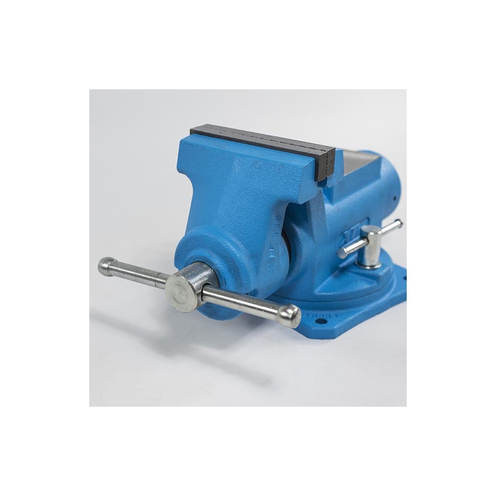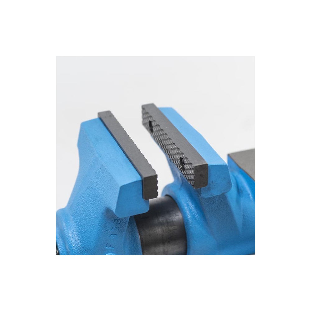Otočný dílenský svěrák s čelistmi z vysoce kvalitní oceli kalenými na 45 HRC ± 5 HRC.