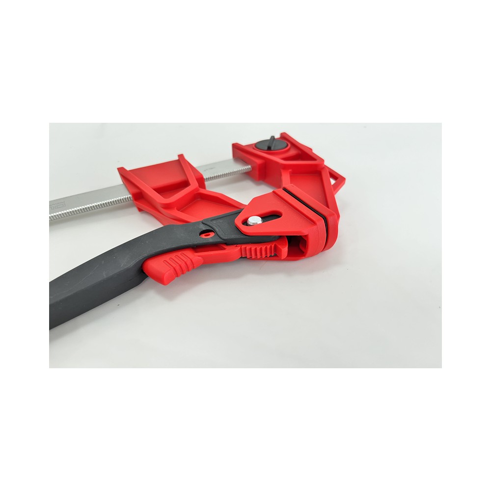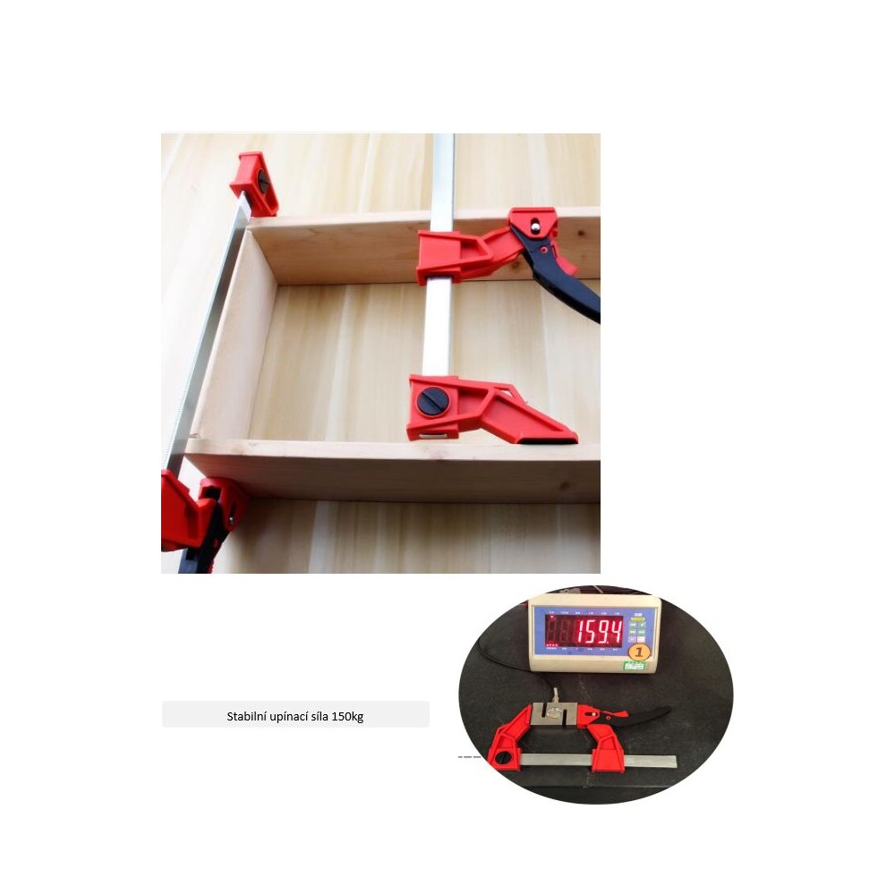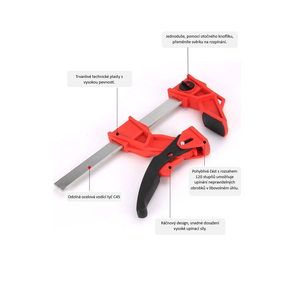 Jednoruční svěrka, utahování pomocí páky. Povolení odjišťovacím tlačítkem. Plastové koncovky...