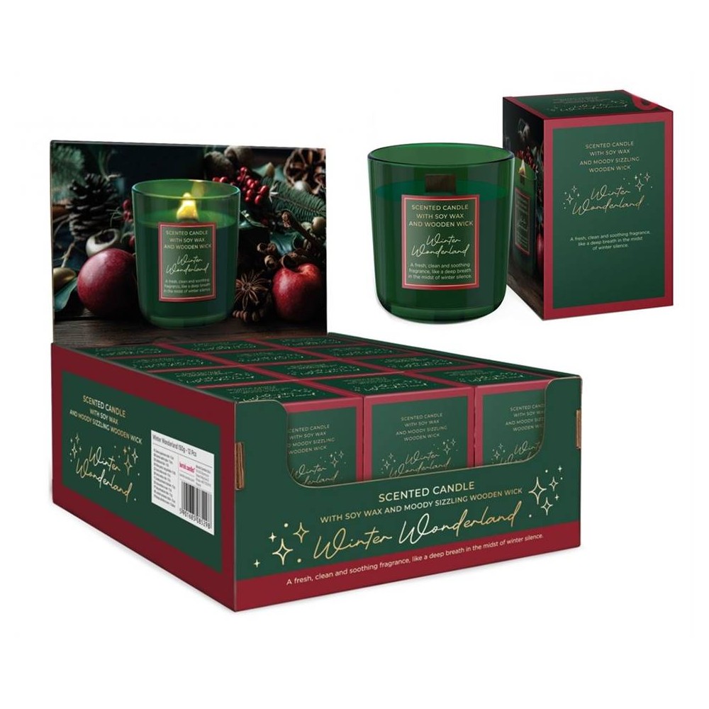 Vánoční svíčka s vůní v kónickém skle, zimní říše divů. Provedení: se sójovým voskem a dřevěným knotem.