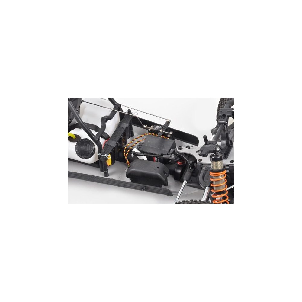 Sestavený model v 1/6 s bílou karoserií a náhonem zadní nápravy osazený spalovacím motorem 26ccm....