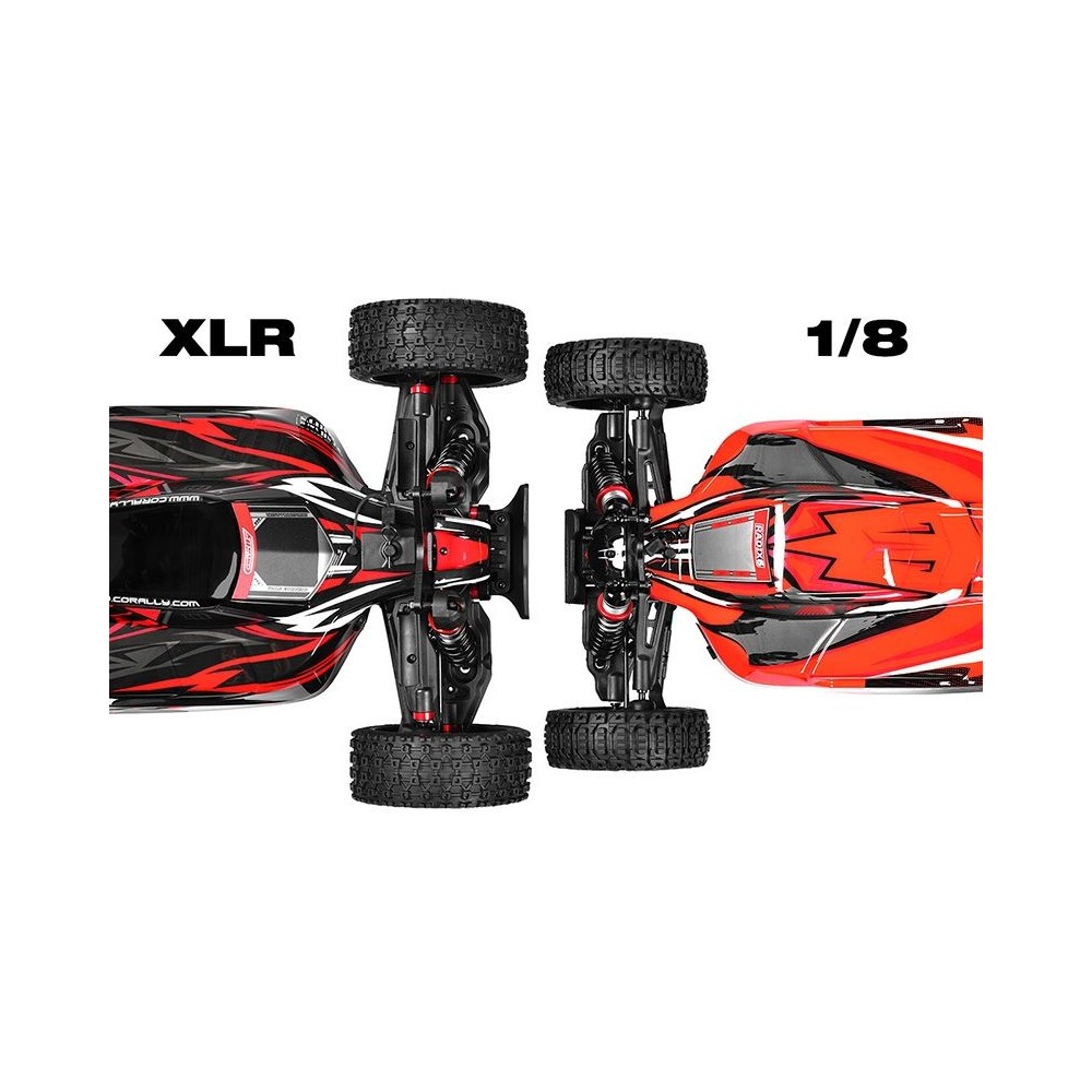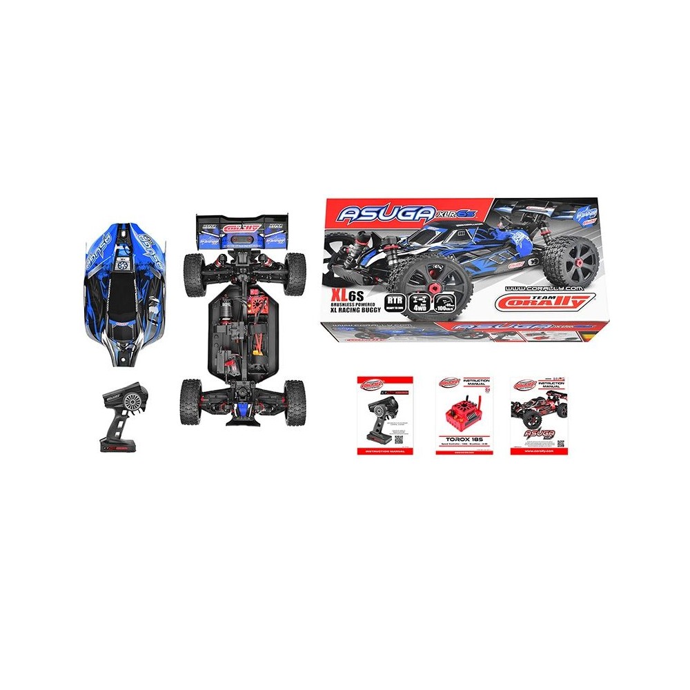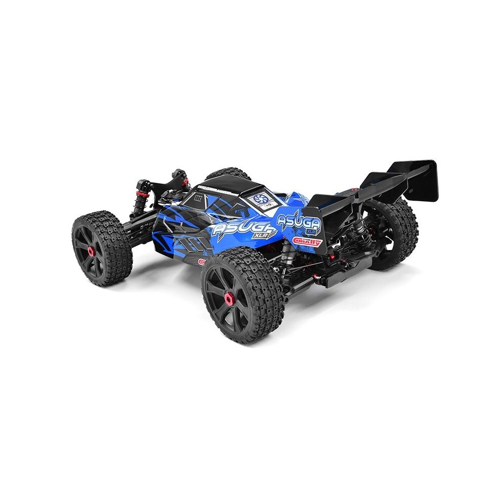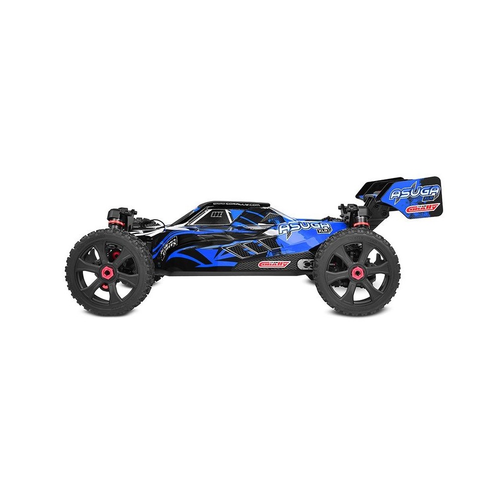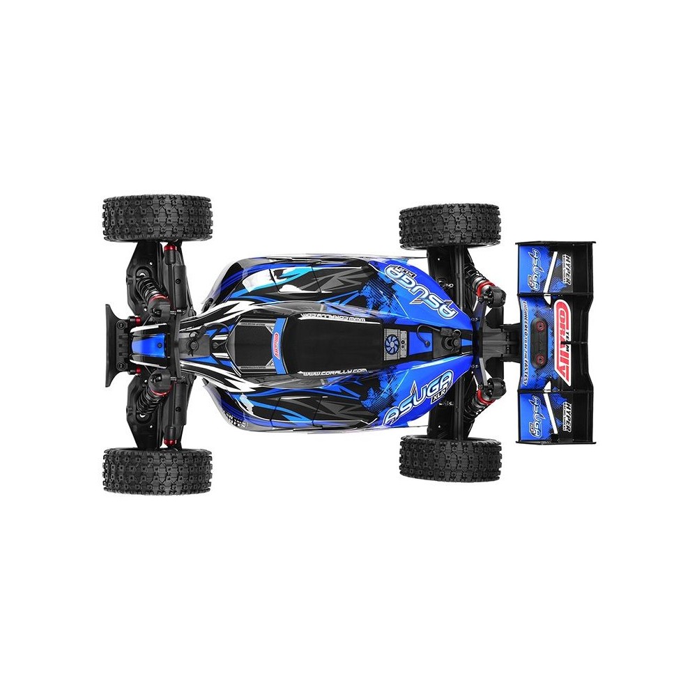 Asuga XLR, která je větší než ostatní modely, přináší zvýšenou světlou výšku, masivní zdvihy odpružení a naddimenzované komponenty na zcela novém podvozku, který využívá osvědčený, odolný a 6S schopný systém hnacího ústrojí, jímž jsou modely Team Corally v měřítku 1/8 proslulé.
