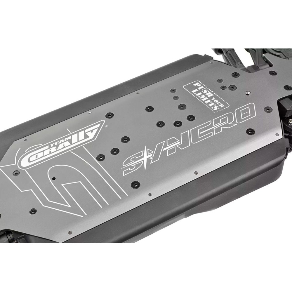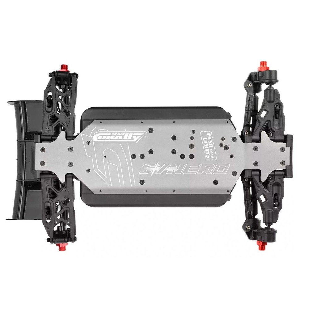 Každá součástka modelu Syncro je navržena s ohledem na odolnost a výkon. Jeho robustní systém zavěšení, inspirovaný vysoce výkonnou řadou 6S týmu Corally, obsahuje odolná ramena zavěšení, zesílené bloky řízení a odolné zadní těhlice. Tyto komponenty pracují v harmonii, aby si model snadno poradil se skoky, nerovnostmi a náročným terénem. Big Bore kompozitové tlumiče a robustní věže tlumičů udržují stabilitu modelu, zatímco lehký, ale pevný podvozek zajišťuje, že je připraven zvládnout jakékoli dobrodružství. Přidejte funkce, jako je kluzná spojka a ocelové převody a výsledkem je zábavná a spolehlivá buggy Syncro.