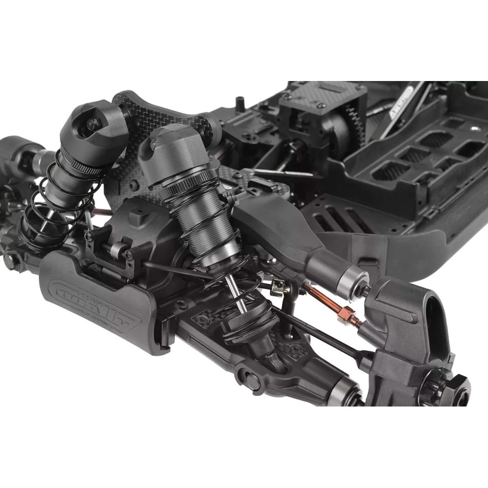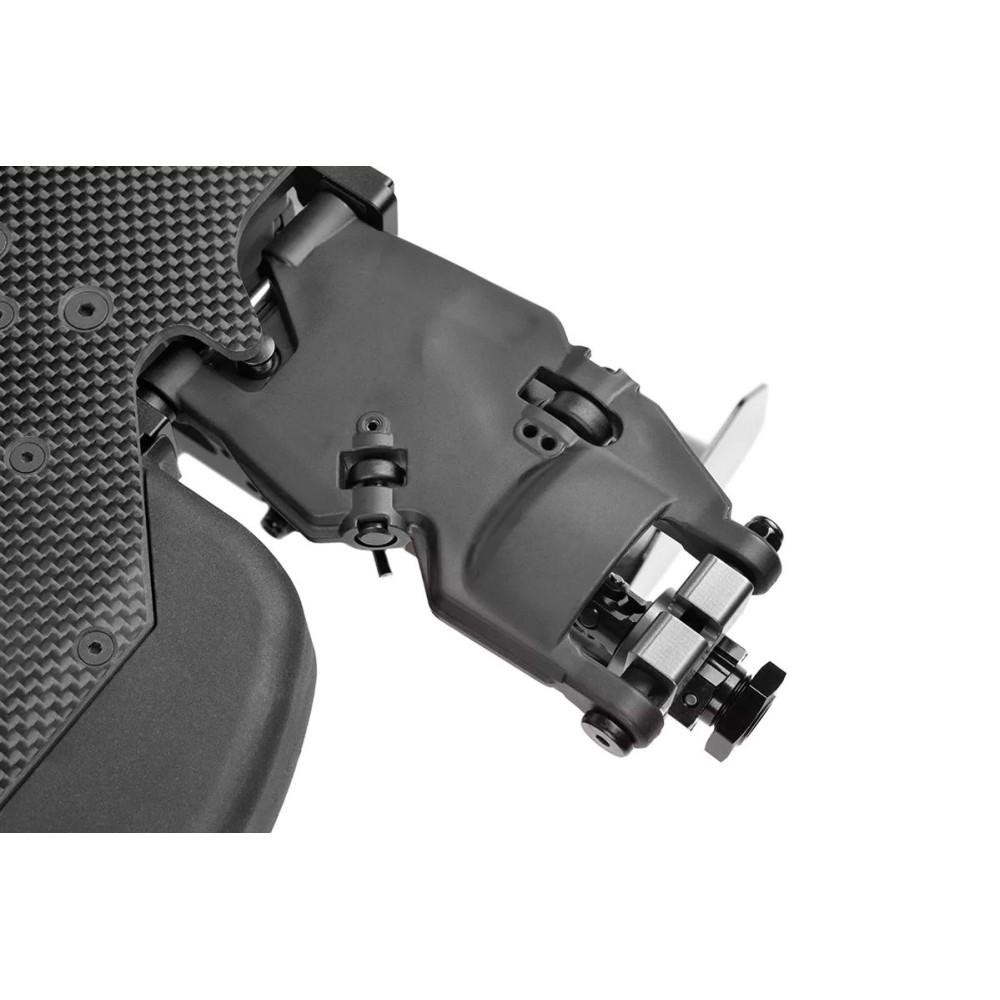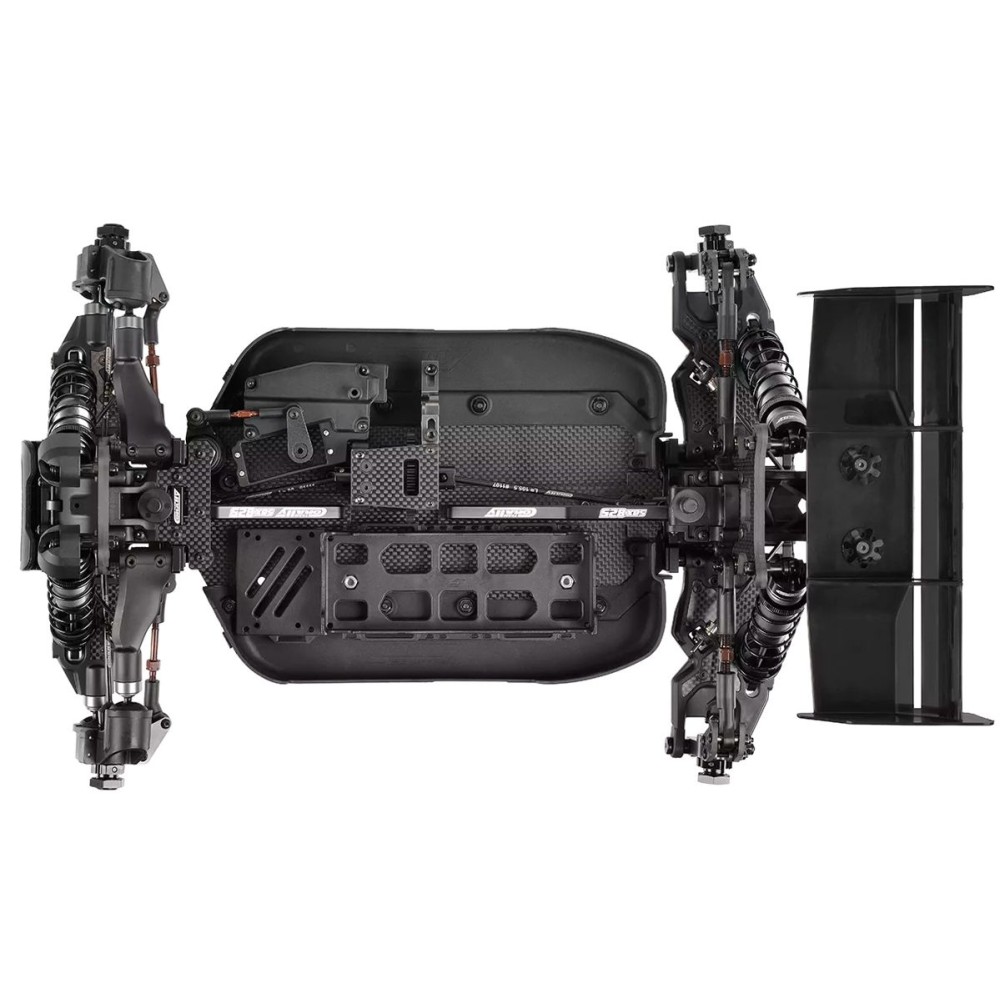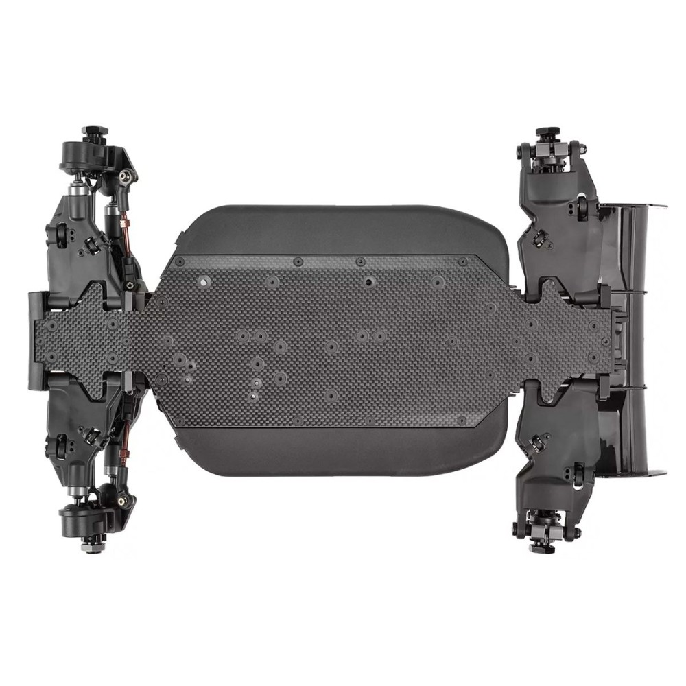 Stavebnice závodního podvozku buggy 1/8 s pohonem 4WD a karbonovým platem. Model bez kol, elektroniky a RC soupravy.