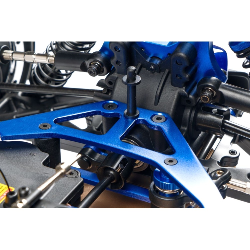 Veškeré spojovací tyče (svorníky ramen apod.) jsou ocelové o průměru 7mm vybavené pravo-levým závitem a šestihranem, což umožňuje pohodlné a přesné nastavení geometrie podvozku. O odpružení se stará čtveřice celokovových olejových tlumičů s vinutými pružinami. Předpětí pružiny je jednoduše nastavitelné pomocí matice s jemným závitem. Modře eloxované držáky tlumičů (parohy) jsou vyrobeny z 8mm silného!!! duralu. Ráfky kol jsou vybaveny šroubovaným límcem, který zajišťuje pneumatiku bez nutnosti lepení. Nízkoprofilové pneumatiky mají osvědčený "buggynový" vzorek a mají průměr 178mm. Bezpečně zastavit tento model to už chce sílu a proto je použita dvojitá kotoučová brzda.