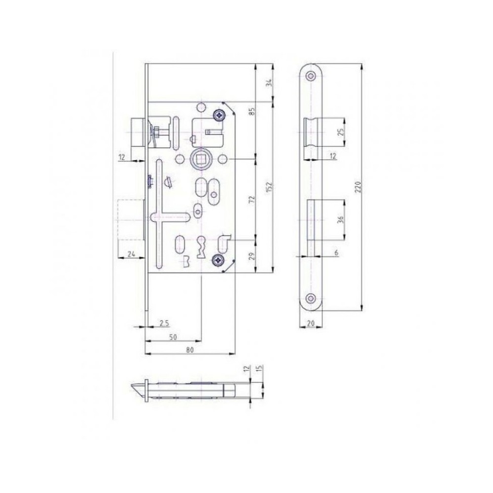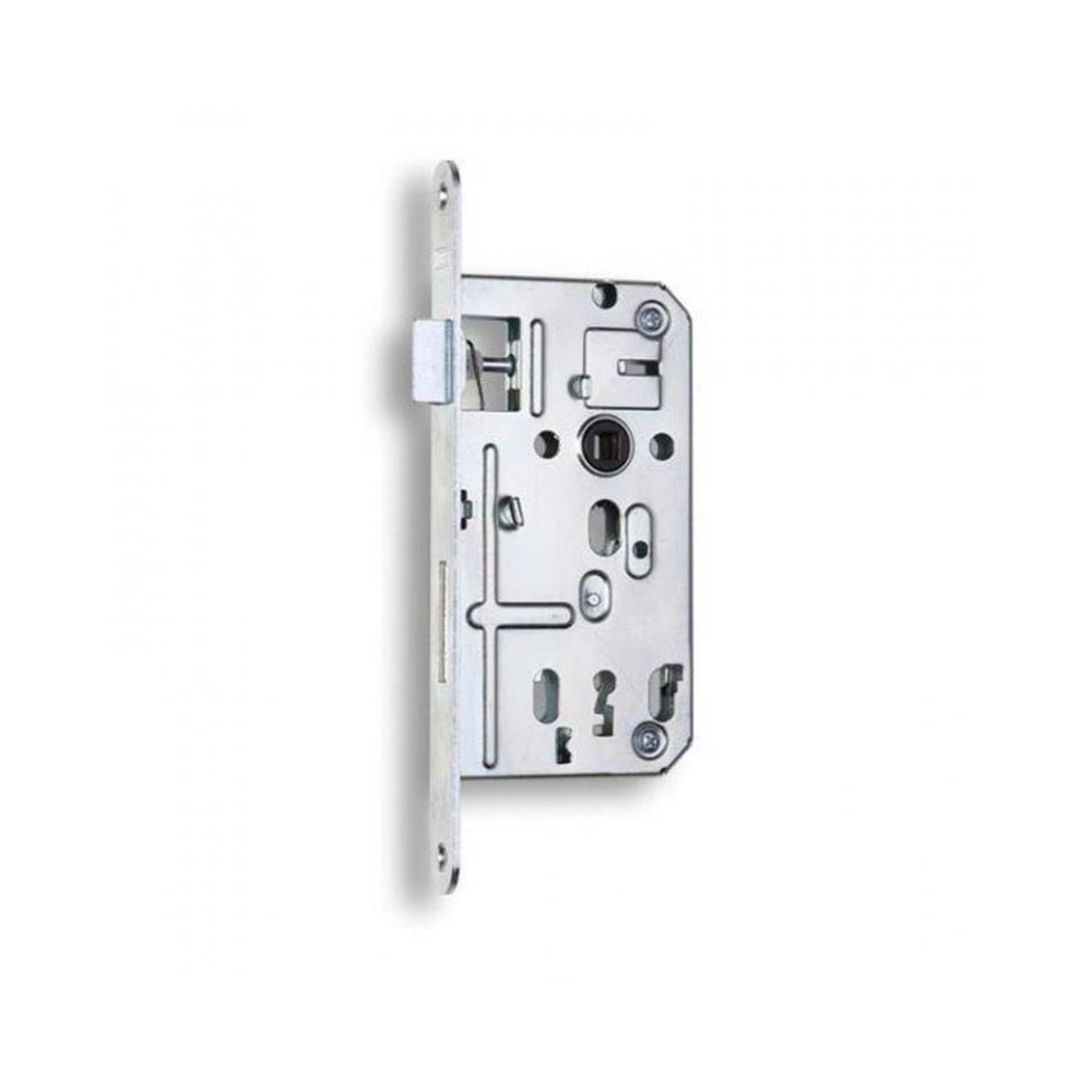 Zámek zadlabací obyčejný, bez převodu - WC zámek. Rozteč 90 mm, střed 50 mm, zádlab 80 mm.