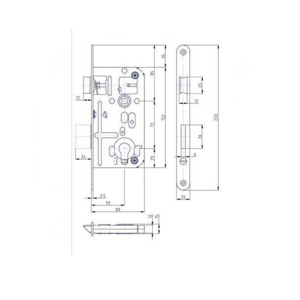 Zámek zadlabací obyčejný, bez převodu - WC zámek. Rozteč 90 mm, střed 50 mm, zádlab 80 mm.
