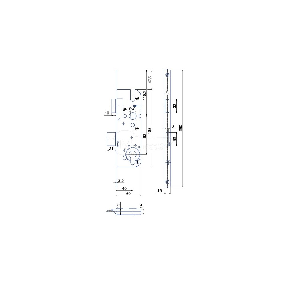 osa 40Zámek zadlabací obyčejný, na klíč, bez převodu. Rozteč 90 mm, střed 40 mm, zádlab 60 mm.