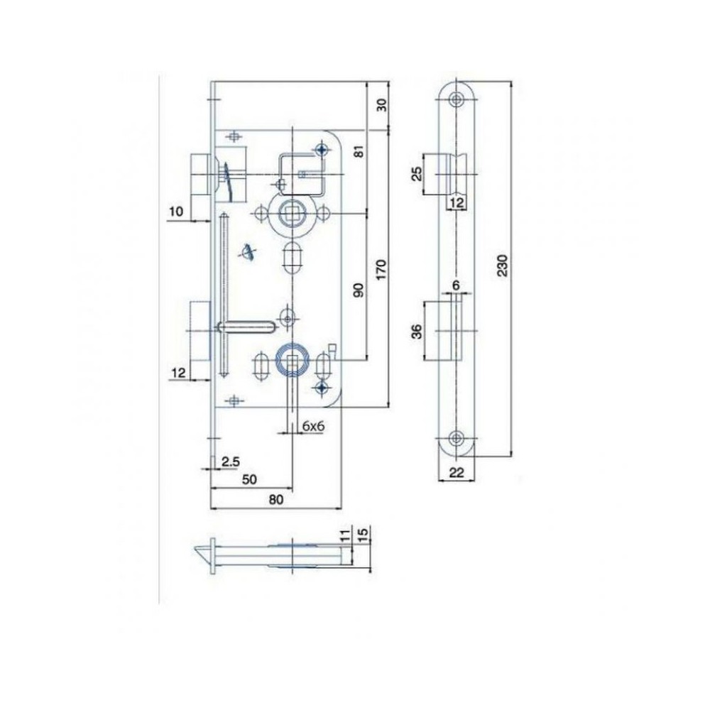 osa 50Zámek zadlabací pro obyčejný klíč, dvouzápadový. Rozteč 72 mm, střed 50 mm, zádlab 80 mm.