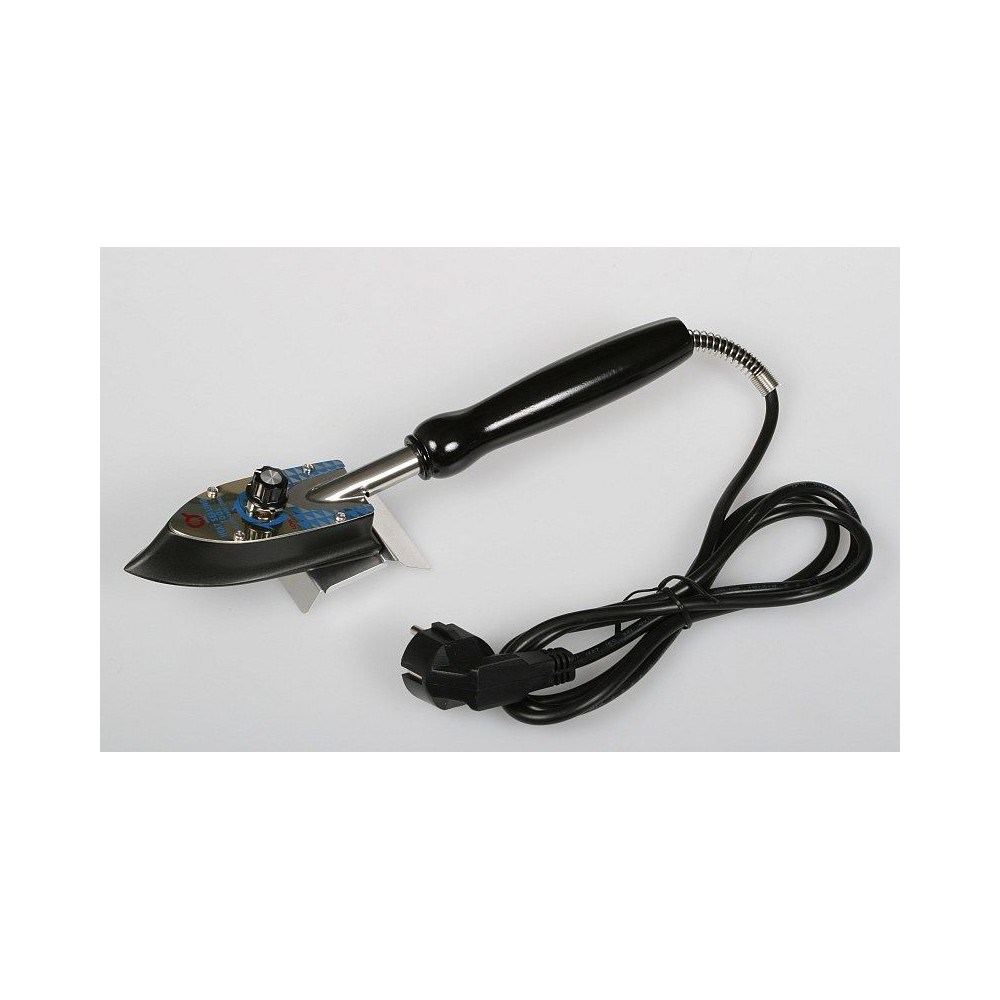 Modelářská potahovací žehlička s teflonem potaženým tělem a regulací teploty s bimetalovým páskem.